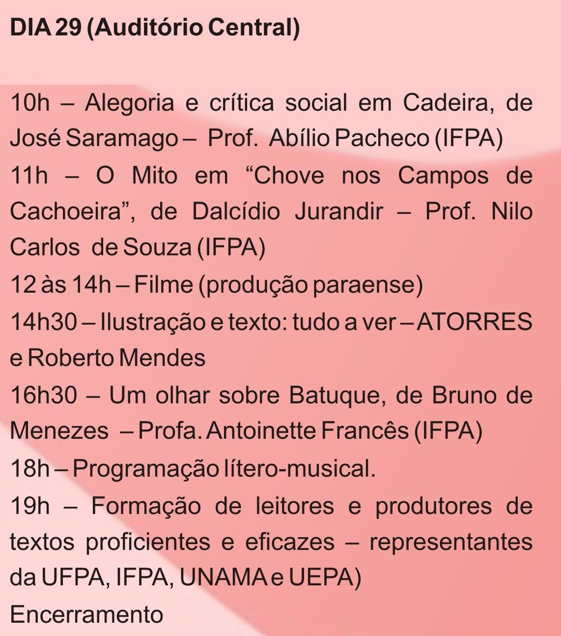 Dia 29, às 10:00 da manhã, durante a Feira de Literatura Paraense no Instituto Federal de Educação, Ciência e Tecnologia do Pará: