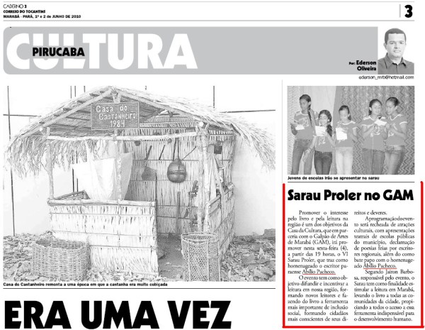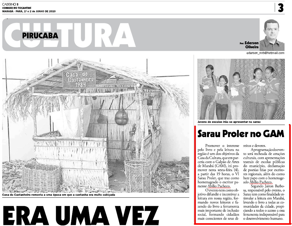 Sarau do Proler – Marabá Sarau do Proler – Marabá: organizado pela Fundação Casa da Cultura de Marabá. Escritor paraense homenageado: Abilio Pacheco.