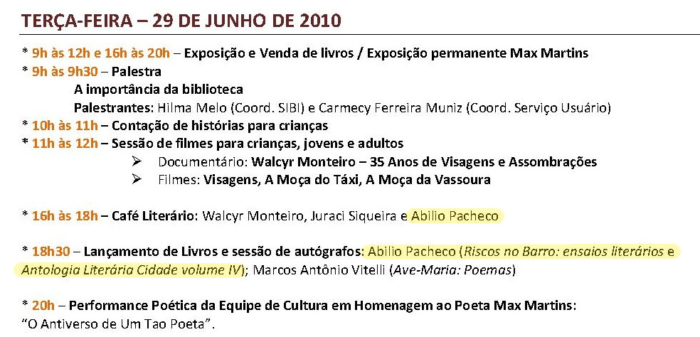 Dia 29 de Junho, durante a III Feira Cametaense do Livro, estarei no Café Literário, das 16h às 18h, ao lado de Walcyr Monteiro e Juraci Siqueira. Logo após, às 18:30, pré-lançamento da Antologia Literária Cidade – Volume IV e re-lançamento do meu Riscos no Barro.