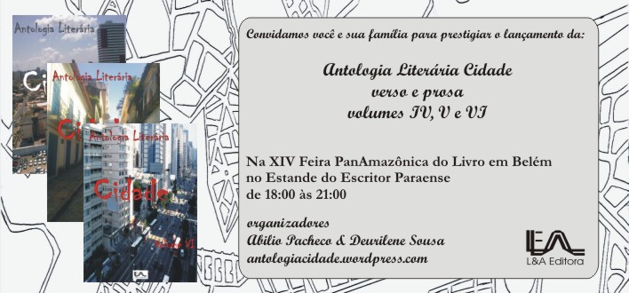 Lançamento Antologia Cidade A Antologia Literária Cidade será lançada dia 02 de Setembro, durante a XIV Feira PanAmazônica do Livro em Belém. Saiba mais em: antologiacidade.wordpress.com