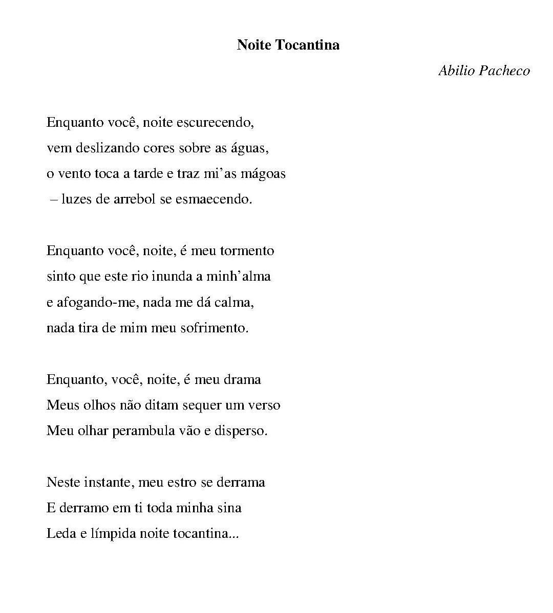 Noite Tocantina Este poema é da época em que eu tentava fazer sonetos. Deve ter uns 15 anos… Desculpem a má métrica e o excesso de localismo, de querencismo. Avalie isto:compartilhe Clique para compartilhar no X(abre em nova janela) 18+ Clique para compartilhar no Facebook(abre em nova janela) Facebook Clique para compartilhar no WhatsApp(abre em nova janela) WhatsApp Clique para compartilhar no LinkedIn(abre em nova janela) LinkedIn Clique para compartilhar no Pinterest(abre em nova janela) Pinterest Clique para compartilhar no Telegram(abre em nova janela) Telegram Clique para imprimir(abre em nova janela) Imprimir Clique para enviar um link por e-mail para um amigo(abre em nova janela) E-mail Curtir Carregando... Relacionado