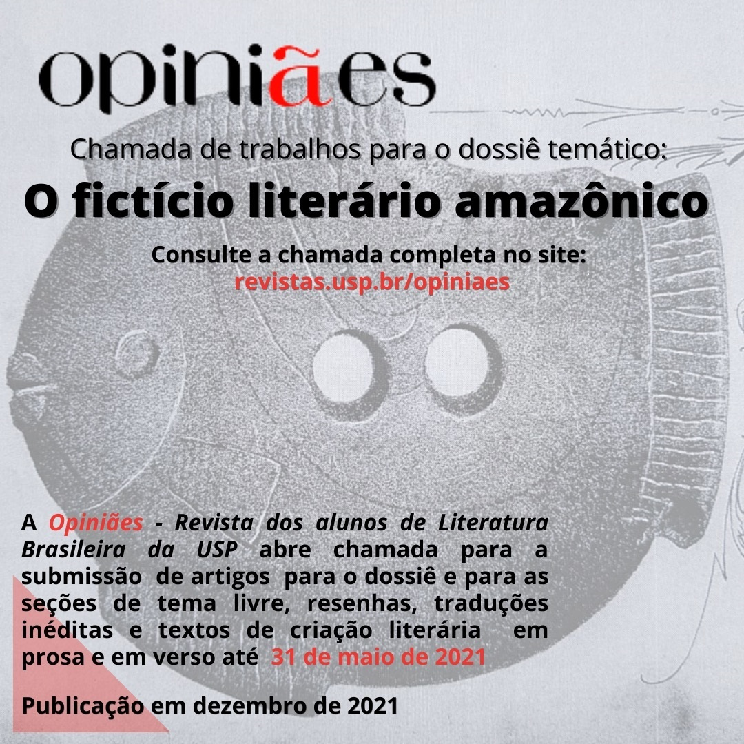 A Opiniâes – Revista dos Alunos de Literatura Brasileira (USP) – convida a comunidade estudantil e os/as pesquisadores/as a enviarem artigos e ensaios inéditos, no campo da literatura brasileira, para compor o dossiê temático “O fictício literário amazônico”, integrante da edição de número 19, a ser publicada em dezembro de 2021. Este dossiê temático tem o objetivo de aproximar as obras amazônicas e seus estudos de eixos regionais que extrapolem os limites da região Norte do Brasil, estimulando uma troca dialética a partir de perspectivas plurais.
