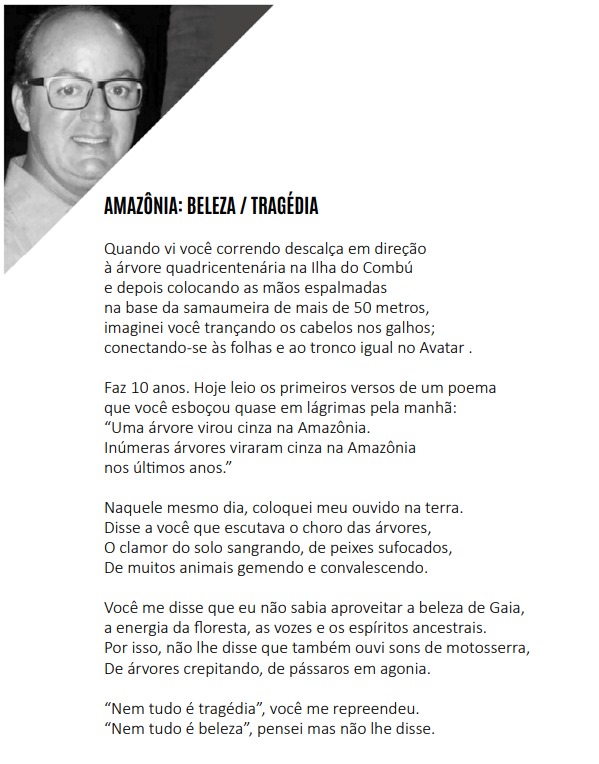 A publicação “tem como objetivo principal trabalhar com a produção de teor testemunhal a partir de um olhar detido sobre a Amazônia, visando tanto a produção de textos em diálogo com a bibliografia concernente ao espaço geográfico quanto a elaboração de reflexões didáticas em prática na região. Nessa mirada, buscando a confluência de perspectivas epistemológicas distintas, ao mesmo tempo focando uma visão acerca do universo amazônico, a obra nasce fecunda com o olhar entre a literatura e o ensino.” (prefácio)